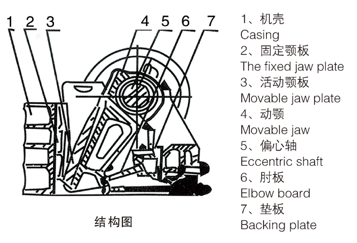 該系列破碎機(jī)工作方式為曲動擠壓型,其工作原理是:電動機(jī)驅(qū)動皮帶和皮帶輪,通過偏心軸使動顎上下運(yùn)動,當(dāng)動顎上升時肘板與動顎間夾角變大,從而推動動顎板向固定顎板接近,與其同時物料被壓碎或劈碎,達(dá)到破碎的目的;當(dāng)動顎下行時,肘板與動顎夾角變小,動顎板在拉桿,彈簧的作用下,離開固定顎板,此時已破碎物料從破碎腔下口排出。隨著電動機(jī)連續(xù)轉(zhuǎn)動而破碎機(jī)動顎作周期運(yùn)動壓碎和排泄物料,實(shí)現(xiàn)批量生產(chǎn)。